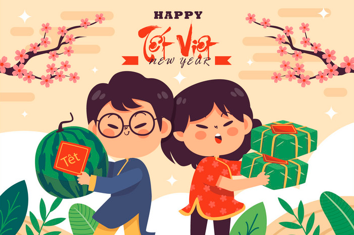 Hình minh họa bánh chưng Tết gói lá dong kết hợp hoa đào hồng trang trí, mang không khí mùa xuân và Tết Nguyên Đán truyền thống Việt Nam. Phong cách vector mềm mại, màu sắc tươi sáng, thể hiện sự may mắn, sum vầy và khởi đầu năm mới. Phù hợp sử dụng cho banner Tết, poster, social media, website hoặc tài nguyên thiết kế lễ hội.