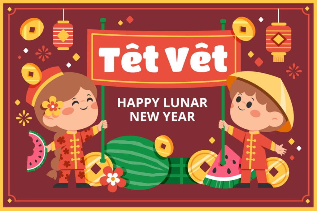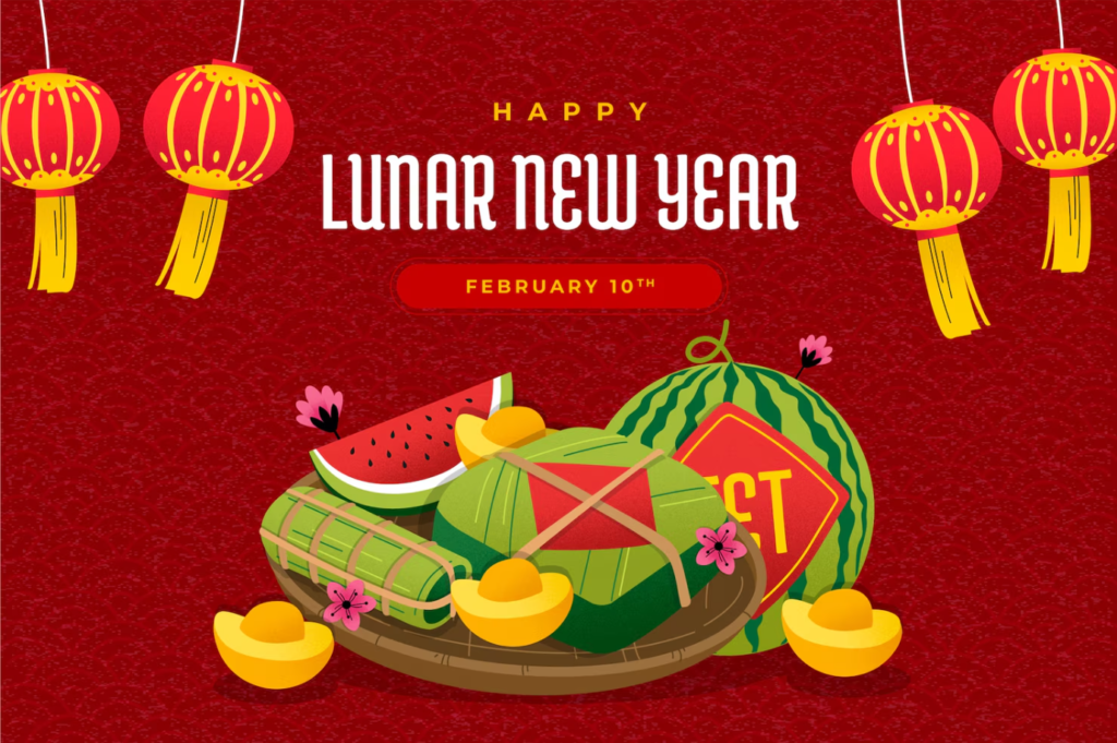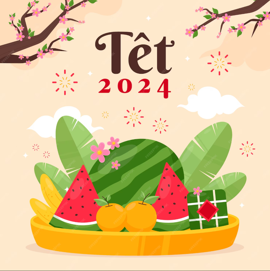 Tết Việt là mẫu minh họa Tết Nguyên Đán phong cách truyền thống Việt Nam, nổi bật với hình ảnh dưa hấu đỏ, bánh chưng, phong bao lì xì và cành hoa mai trên nền đỏ may mắn. Thiết kế sử dụng màu sắc tươi sáng, đường nét phẳng hiện đại kết hợp họa tiết trang trí Á Đông, mang không khí sum vầy và tài lộc ngày đầu năm. Hình ảnh phù hợp sử dụng cho poster Tết, banner website, ấn phẩm truyền thông, bài đăng mạng xã hội, thiết kế bao bì hoặc trang trí chủ đề Lunar New Year.
