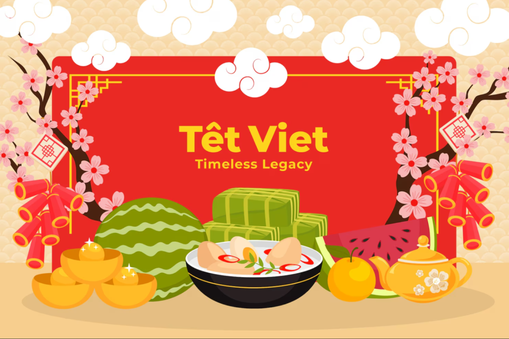 File nền Tết màu đỏ phong cách truyền thống, bố cục trống ở trung tâm dễ chèn chữ. Trang trí viền với trái cây ngày Tết, bánh tét, lá dong và họa tiết xuân. Phù hợp dùng làm background banner Tết, poster chúc xuân, ảnh bìa fanpage, ấn phẩm in ấn và thiết kế digital.